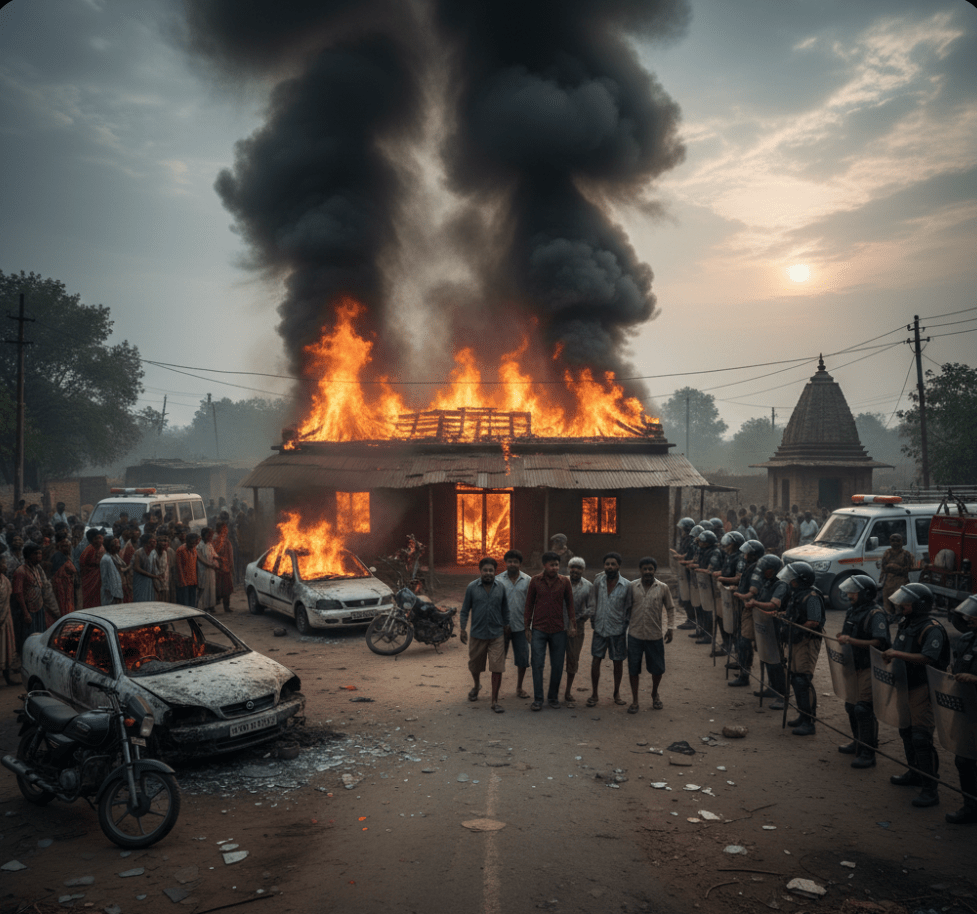 आगजनी और तोड़फोड़: गुस्साए ग्रामीणों की भीड़ ने आरोपियों के घर को घेर लिया। देखते ही देखते विरोध प्रदर्शन हिंसक हो गया और भीड़ ने आरोपियों के घर और वहां खड़ी गाड़ियों (कार और बाइक) में आग लगा दी।